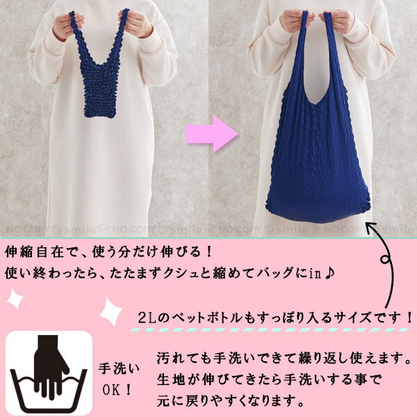 絞り素材の新感覚、使う分だけ伸びて見た目CUTEなストレッチエコバッグraraのLargeサイズ。